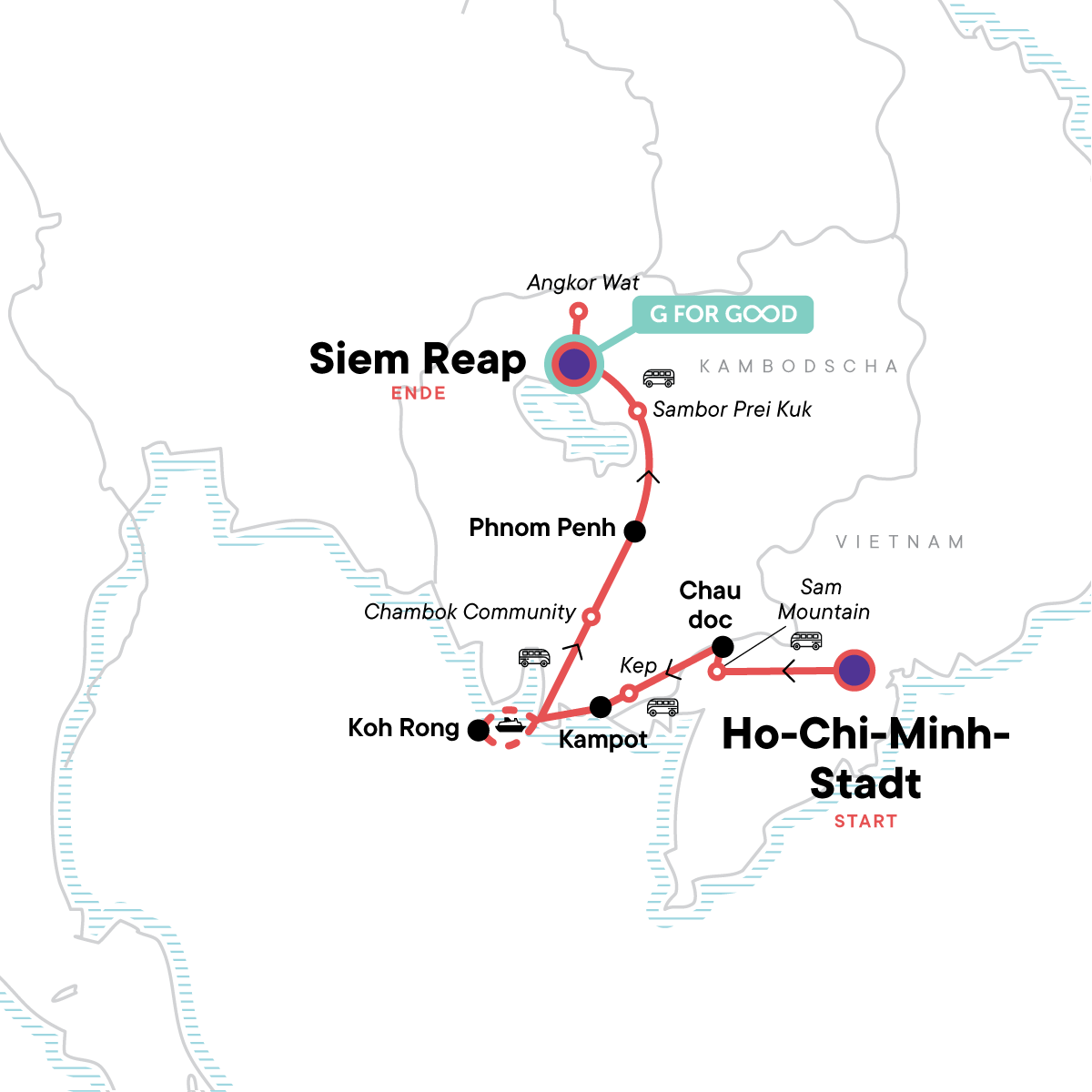"Bereit für ein Abenteuer? Es geht in den Monivong-Bokor-Nationalpark, der für seine von der Natur überwachsenen und mit großartigen Graffitis übersäten Palastruinen berühmt ist. Euer CEO führt euch durch diesen bizarren Kontrast von grünem Dschungel, Ruinen und atemberaubender Aussicht auf die Küste. Bist du dann bereit für den Strand? Und wie! Es geht zum Serendipity Pier und mit der Fähre zur abgelegenen Insel Koh Rong. Stell dein Gepäck im Hostel ab und geh dann direkt zum Strand. Das Paradies, von dem du immer geträumt hast? Hier hast du es gefunden!" (F)